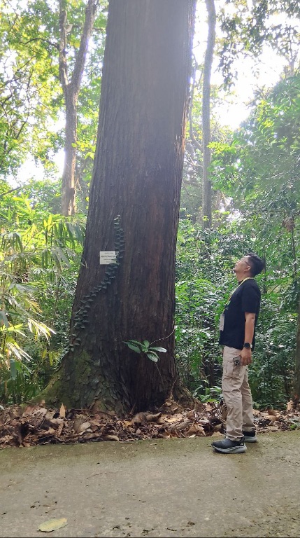 Pemred Disway Kaltim Arie Pramana Putra berdiri di depan pohon Mahoni usia ratusan tahun, di Tahura Banten.-Bayong/Disway Kaltim-